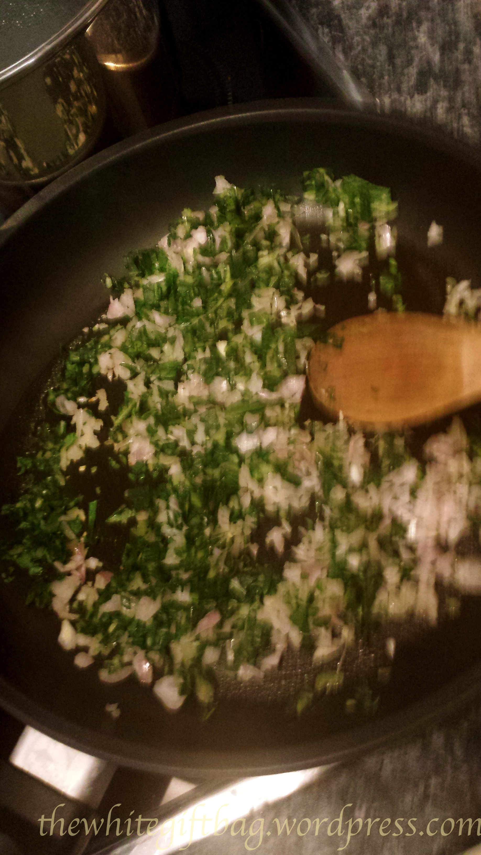 Den Mangold auch zerkleinern und gemeinsam mit den Zwiebeln und etwas Öl oder Pflanzencreme anschwitzen. Nach ein paar Minuten auf einen Teller geben und die Pfanne kurz auswaschen. Falls man eine zweite Pfanne hat, kann man auch diese verwenden.