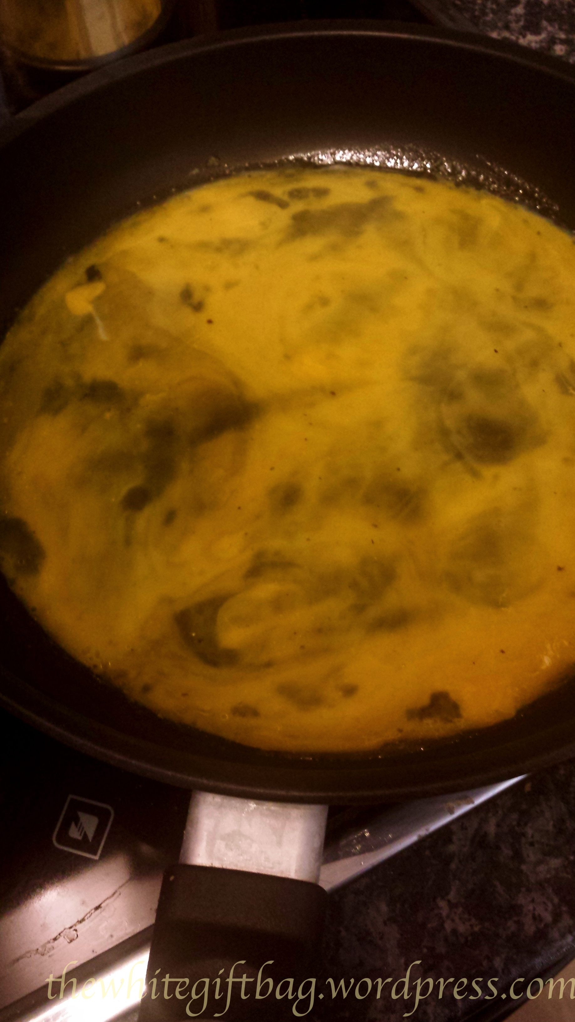 Noch etwas Öl oder Pflanzencreme in der Pfanne verteilen und dann die Ei-Mixtur darin verteilen. Bei mittlerer Hitze braten bis das Ei zu stocken beginnt und nur mehr an der Oberfläche leicht flüssig ist.