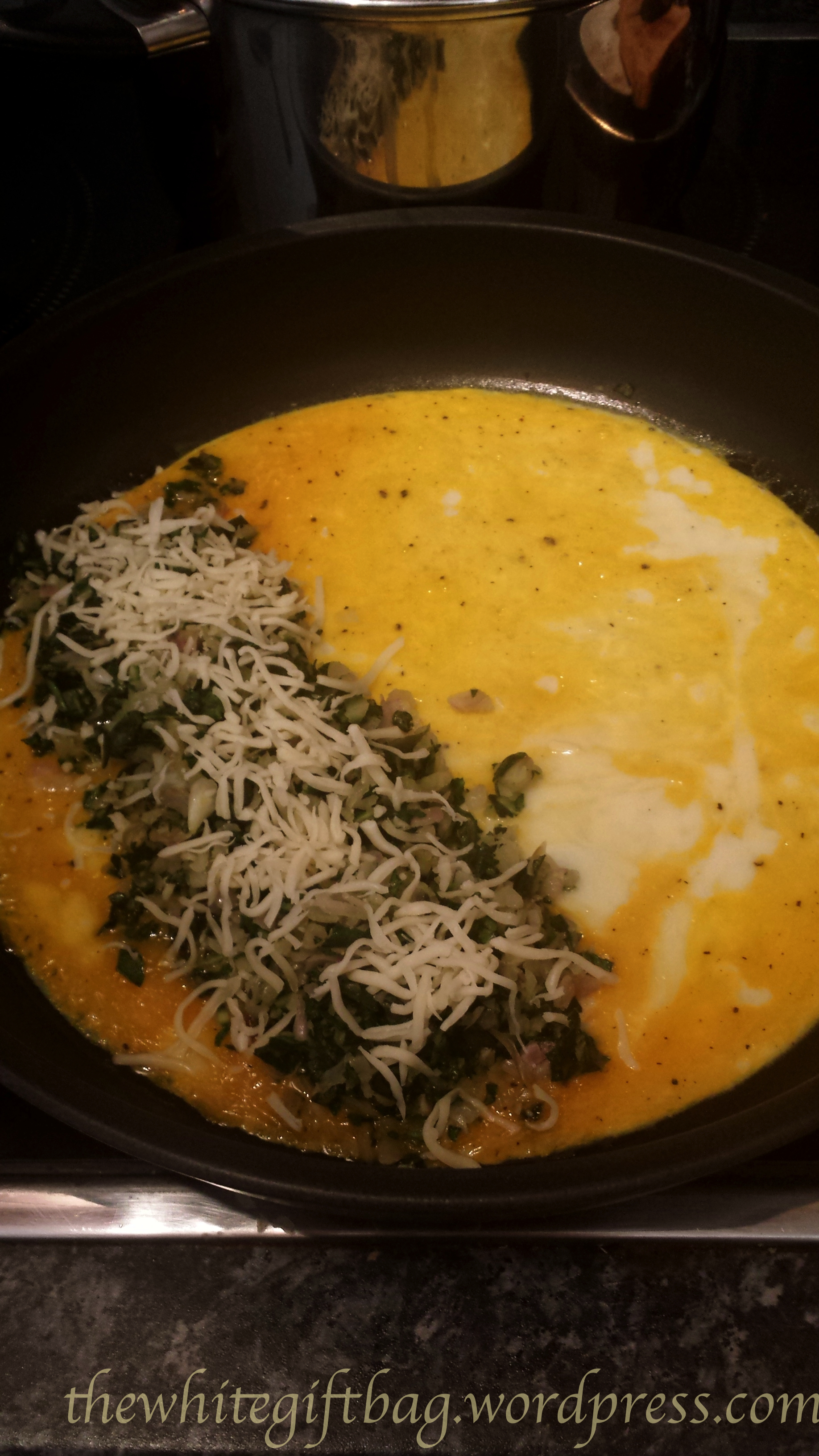 Mangold, Schalotten und Käse auf eine Hälfte des Omlettes geben und dann in der Hälfte zusammenschlagen.