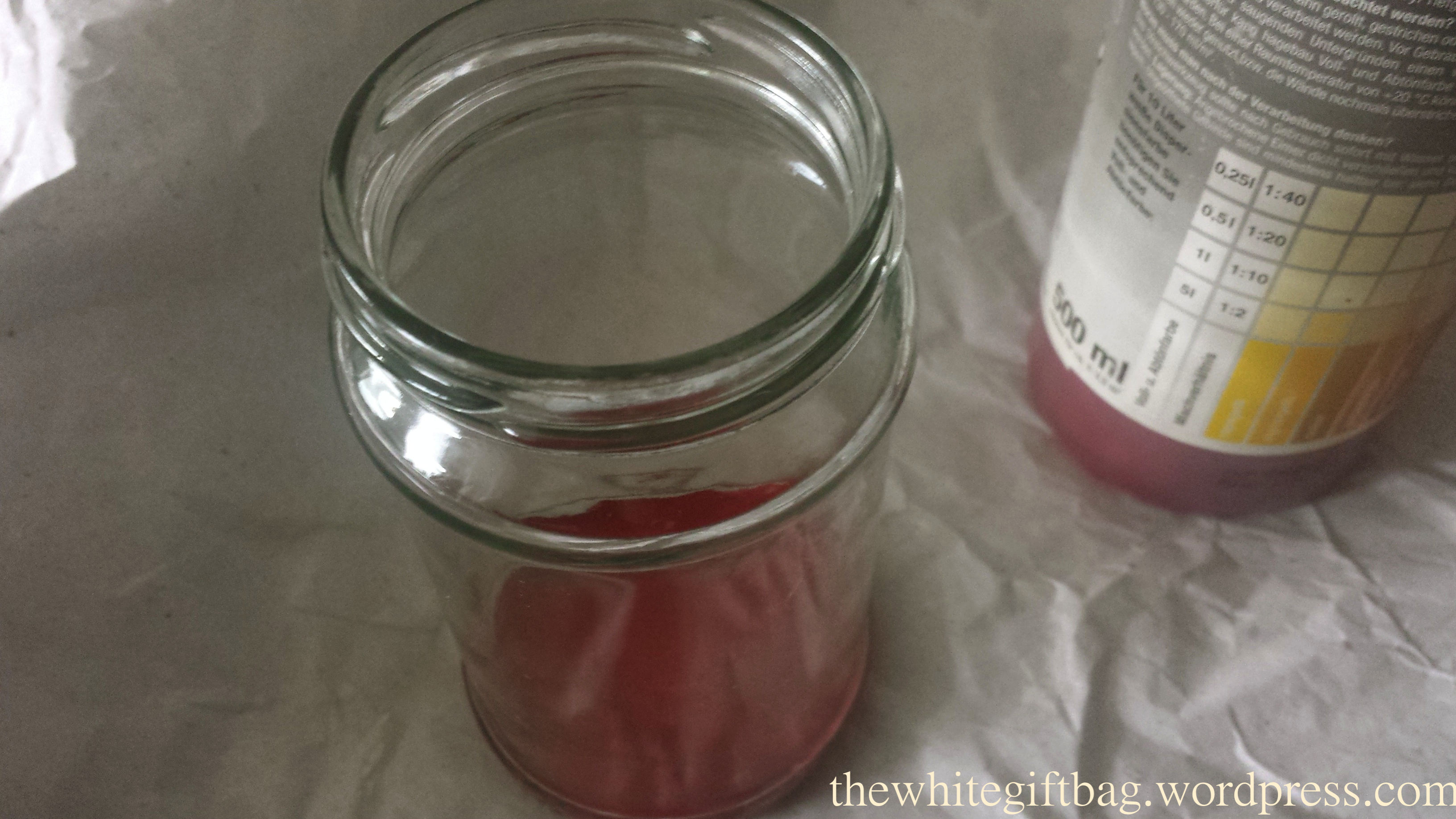 Man gibt etwa einen Teelöffel Farbe in das Glas. Bloß nicht zu viel erwischen, sonst dauert das Trocken eine halbe Ewigkeit. Man kann ja immer wieder Farbe dazugeben, falls man mehr benötigt.