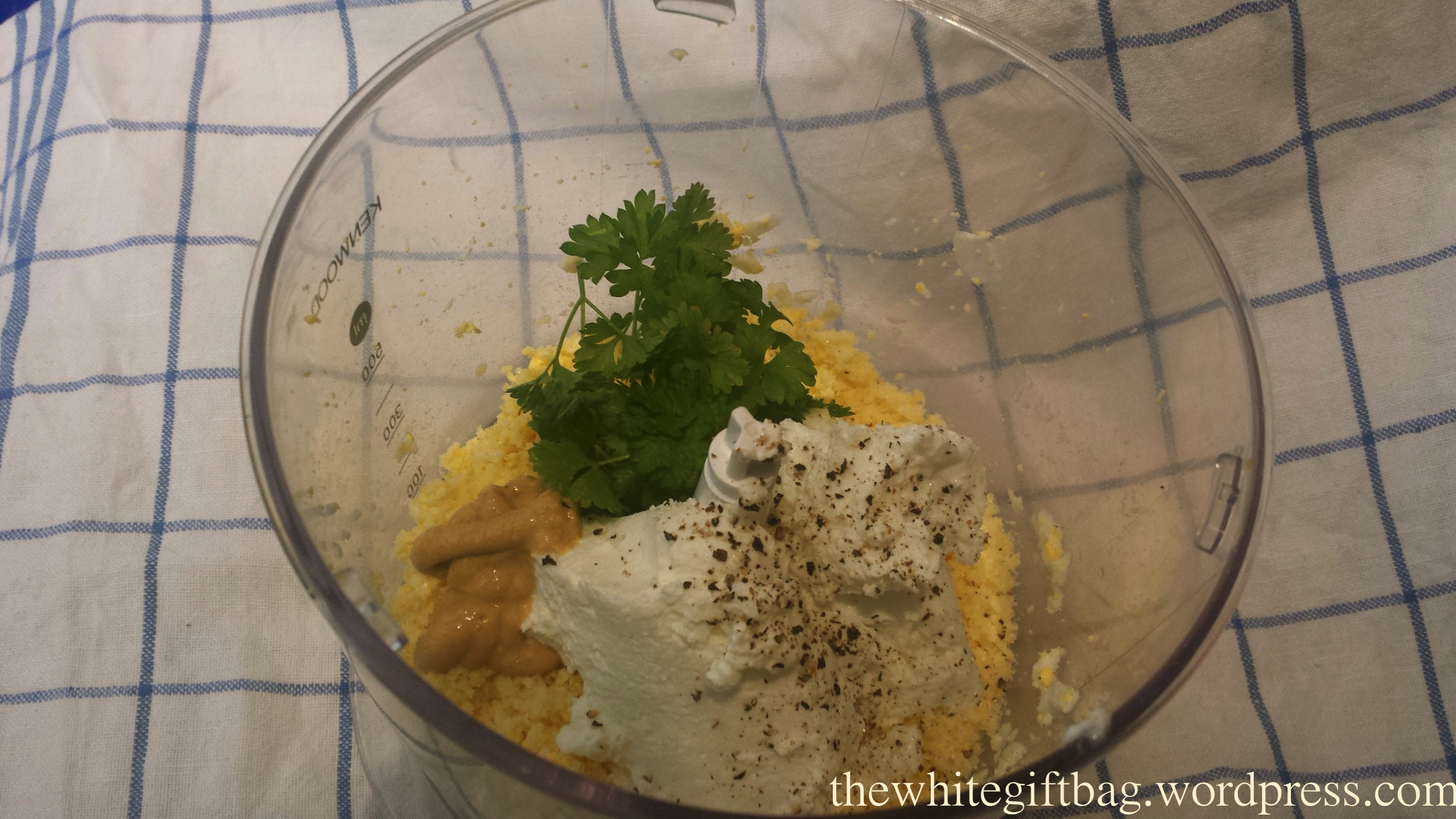 Das Ei in der Hälfte auseinander schneiden und in der Küchenmaschine zerkleinern.