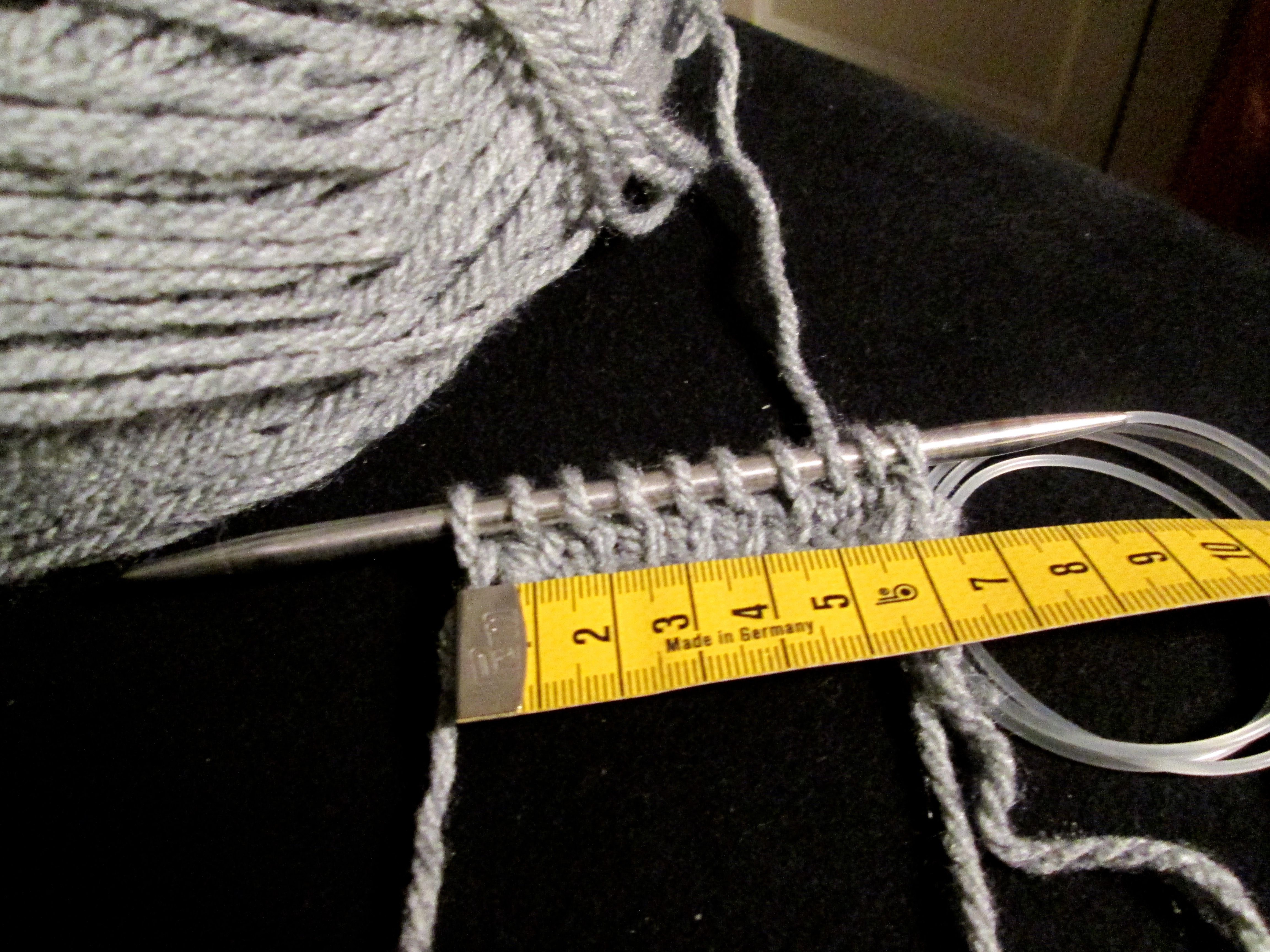 Bei der Maschenprobe will man herausfinden, wie viele Maschen man mit der verwendeten Wolle pro Zentimeter strickt. So kann man dann die benötigte Maschenzahl für den Kopfumfang ausrechnen. Wenn ihr das schon wisst, könnt ihr diesen Schritt natürlich auslassen. Ich finde aber, dass das nie so einfach zu sagen ist, deswegen lieber auf Nummer sicher gehen. Strickt so 2-3 Reihen mit 10-15 Maschen, das sollte ausreichen. Wenn ihr euch dann ausgerechnet habt, wie viele Maschen es pro Zentimeter sind, müsst ihr noch euren Kopfumfang abmessen und rechnet euch die Anzahl der Maschen für die Mütze aus.