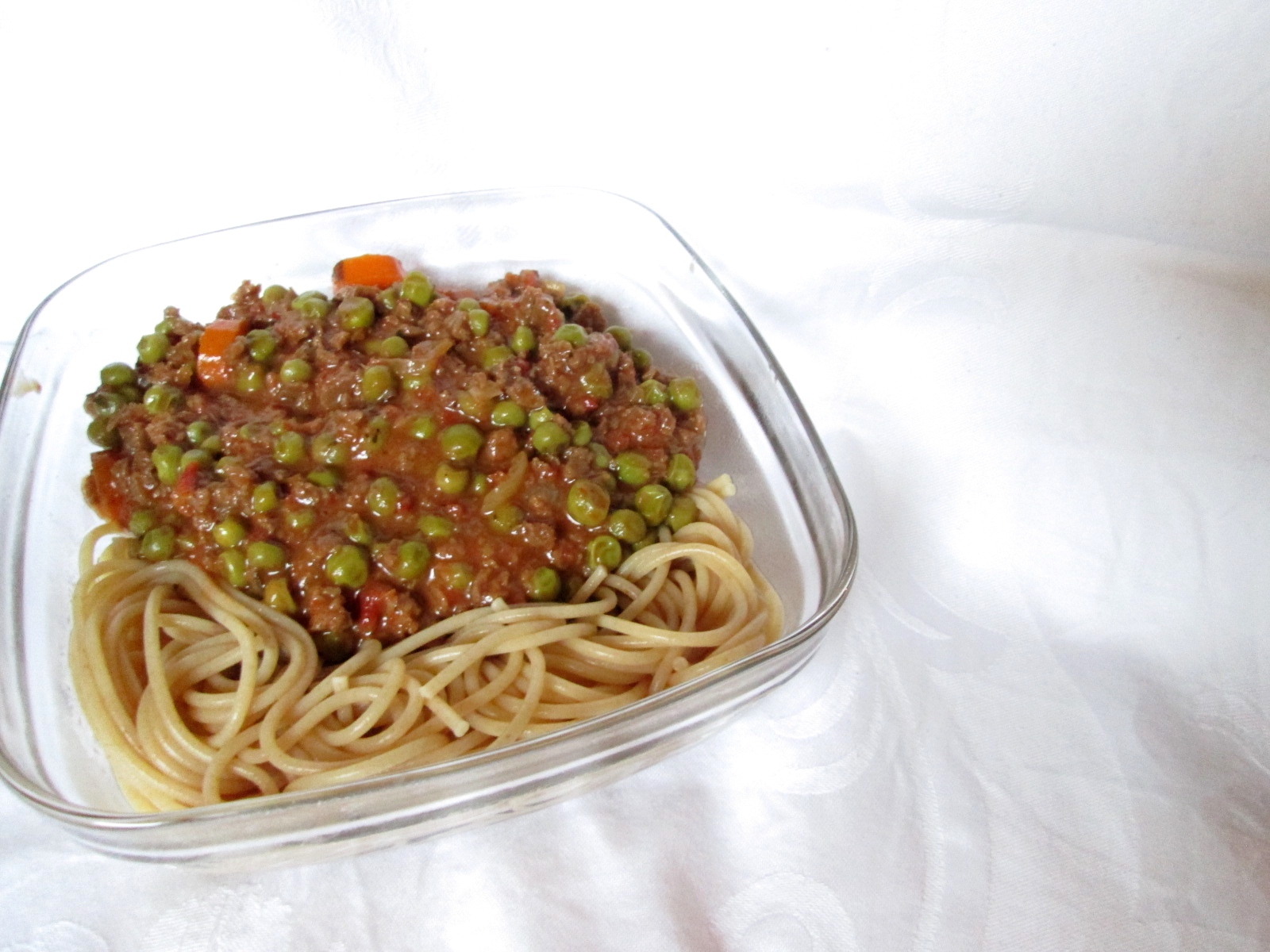 Hier ein kleiner Tipp: Die Soja-Bolognese habe ich mit einem Halbfertig-Produkt zubereitet und dann noch Erbsen dazugegeben. Auf Halbfertig- oder teilweise sogar Fertigprodukte zurückzugreifen ist zeitsparend und meiner Meinung nach ab und zu OK, solange auch frisches Gemüse dazukommt.