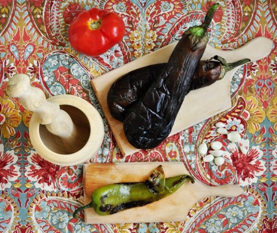 Roasted Eggplant Dip (kyopoolu) With Eggplants, Red Peppers, Garlic Cloves, Olive Oil, Vinegar, Tomato, Salt