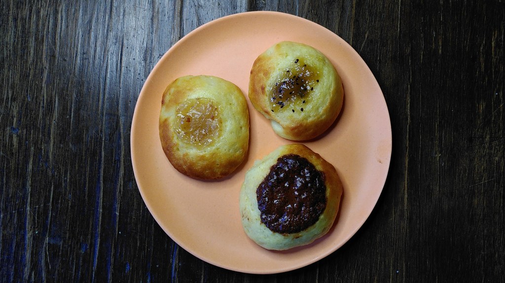 Wenn alle Teigtaschen geformt und auf dem Backblech verteilt sind, wird die Mulde in der Mitte nach Belieben befüllt. Ich habe diesmal Birnen-Marmelade, Kiwi-Marmelade und selbstgemachte Nutella verwendet. Aber der Fantasie seien hier keine Grenzen gesetzt.